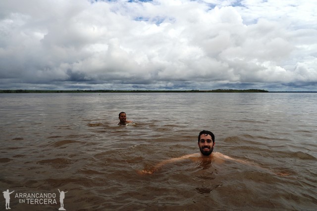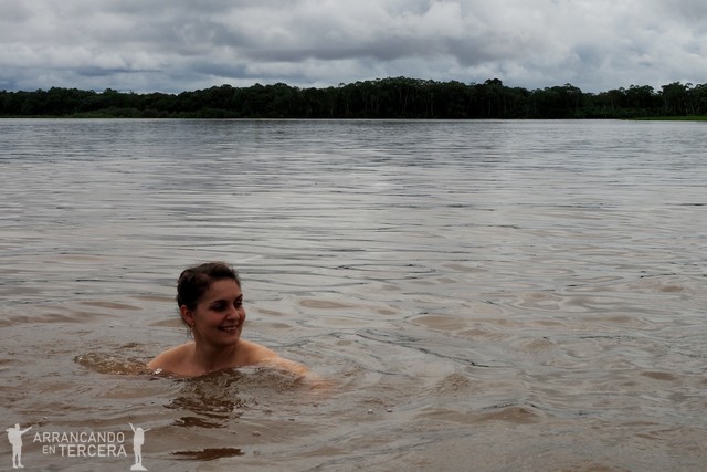 Allí nos avisan de lo que hemos venido a ver: delfines de río. Porque sí: no solo hay delfines en el mar. De vez en cuando vemos algún lomo surcando el agua con timidez en la lejanía. Y entonces nos dice Edgar: «Bueno, ¿quién se quiere bañar?». Y nosotros: «Eh… ¿pero aquí no hay caimanes, serpientes y pirañas?». Él se ríe de nosotros y dice «Naaaah ellos no vienen acá, esto es zona abierta», y se lanza al agua sin pensárselo dos veces.
