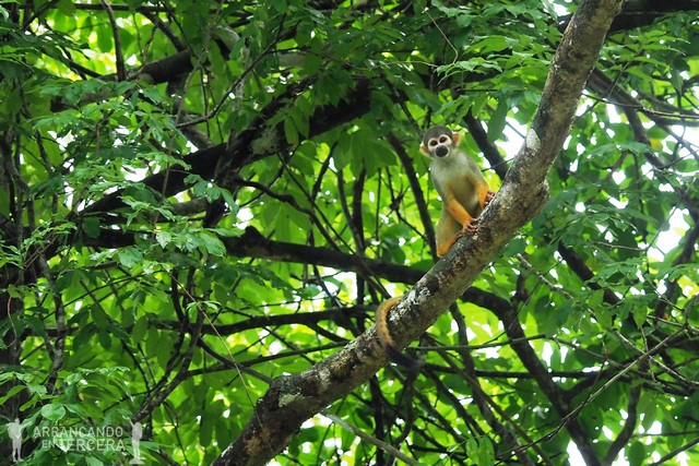Por suerte para nosotros, las ramas que se alzan sobre nuestra barca se balancean y sorprendemos a unos vecinos que nos apasionan mucho más, y muy de cerca. ¡Monos ardilla!