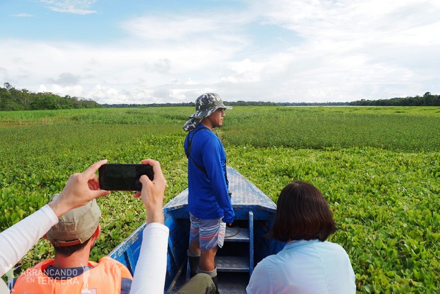 Con sutiles señas de mano desde la proa, Edgar da indicaciones a Mayer, que maneja el motor desde la popa (sin mediar palabra sabe cuándo tiene que girar, acelerar o detenerse). Nos salimos de los afluentes para entrar en una zona inmensa que parece un gigantesco lago.