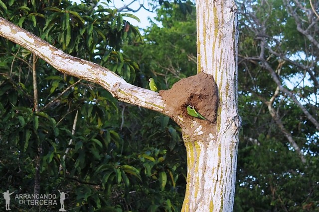 Vemos una pareja de pihuichos de ala blanca, unos pequeños loros que también son conocidos como «periquitos aliamarillos». Aquí podemos ver cómo construyen su casita en un nido de termitas gracias a sus propiedades antibacterianas, como ya hablamos en la anterior entrada. Una vez han incubado los huevos y cuidado a los polluelos, el padre y la madre vuelven a los dormideros comunales, donde se juntan a centenares.