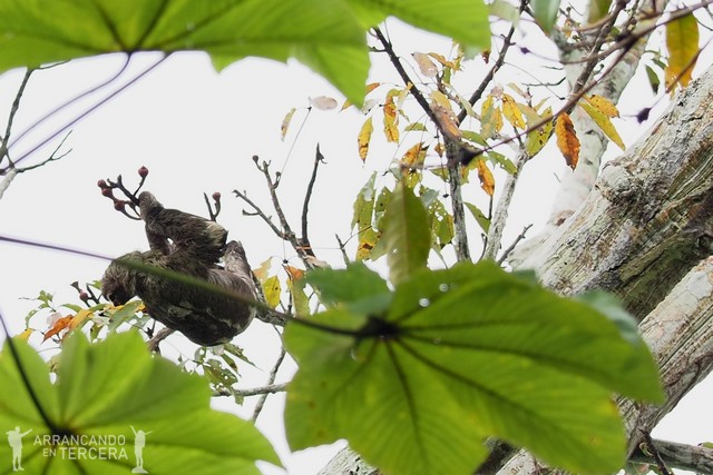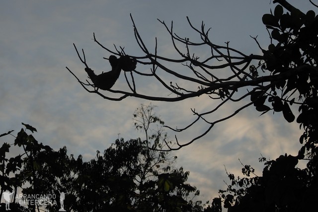 «¡Mirad allí arriba!», nos susurra Edgar. Oculto a lo lejos entre las hojas de los árboles (no sé cómo leches es capaz de localizarlos), está comiendo tranquilamente un oso perezoso de tres dedos. Estos animales reciben su nombre del pecado capital de la pereza, pues se mueven lentísimos ya que tienen el metabolismo más bajo de todos los mamíferos conocidos.