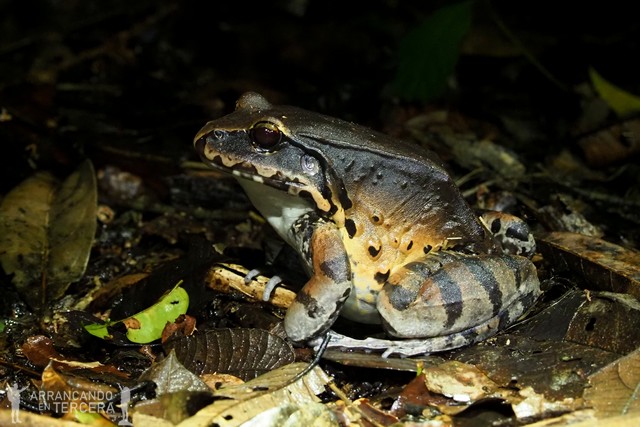 Después de 20 minutos remando por la selva inundada, esquivando raíces, piedras, lianas y plantas tropicales varias, llegamos a tierra firme. La caminata como tal dura apenas una hora, pero cunde bastante; y es que a los pocos metros vemos una rana gigantesca.