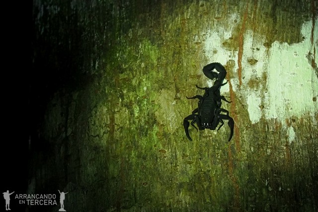 También vemos un escorpión negro peruano, endémico de la zona, otro depredador nocturno que durante el día permanece escondido e impone mucho respeto. No caza de forma activa, suele atacar por emboscada cuando su presa se acerca. Este ejemplar era muy pequeño, como un dedo pulgar. No es una especie agresiva con humanos, pues suele huir, pero tampoco hay que acercarse a acariciarlo: su aguijón inocula un veneno con neurotoxinas que pueden provocar vómitos, sudoración, dolor abdominal, taquicardia…