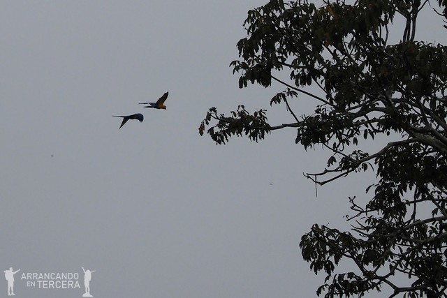 Una pareja de guacamayos amarillo-azulados surcan el cielo aleteando hasta su nido. Son los típicos guacamayos preciosos que, desgraciadamente, se venden como mascotas en algunas tiendas. Son animales monógamos que mantienen su pareja de por vida.