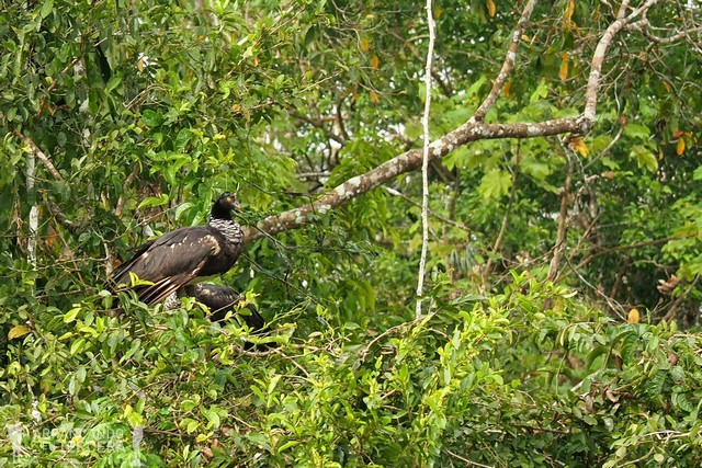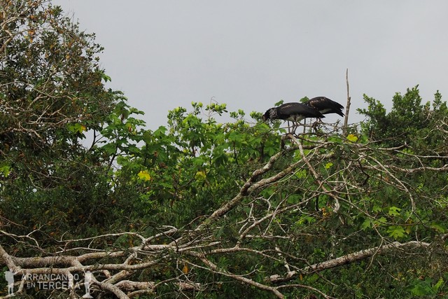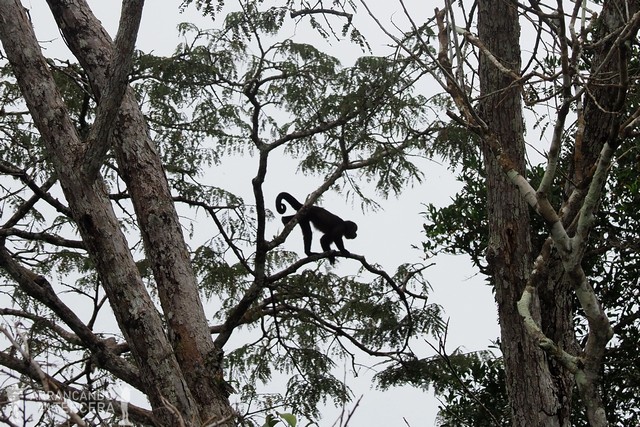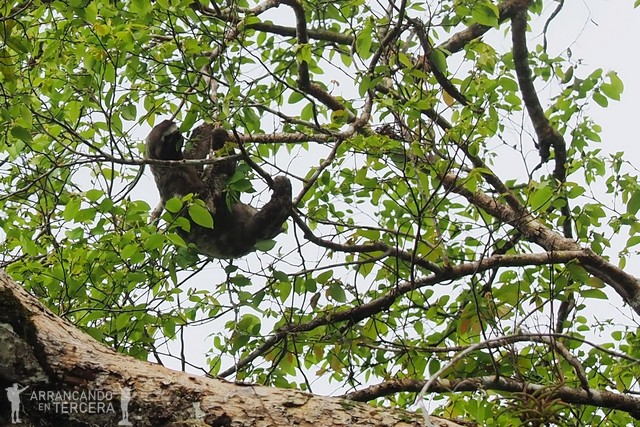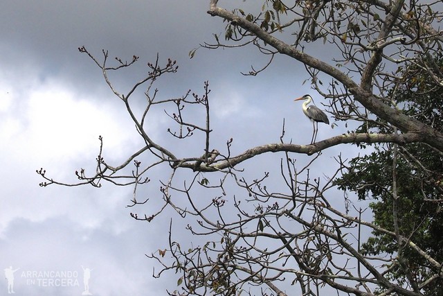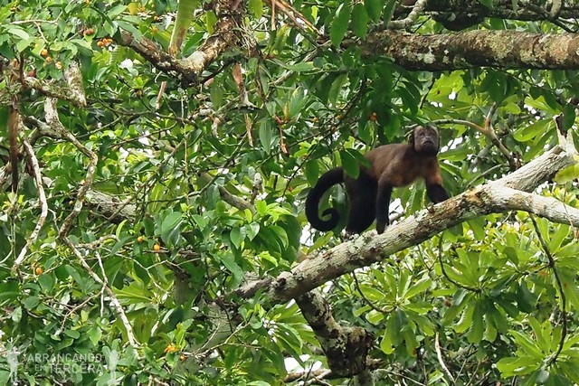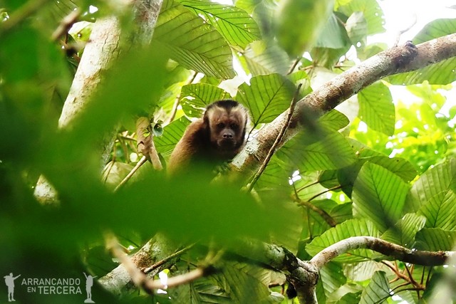 Al poco de empezar tenemos la suerte de avistar una nueva especie de mono arbóreo: el machín negro o «capuchino de cabeza grande». Ruidosos y vivarachos, estos monos se desplazan de árbol en árbol buscando alimento.