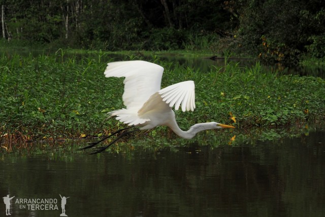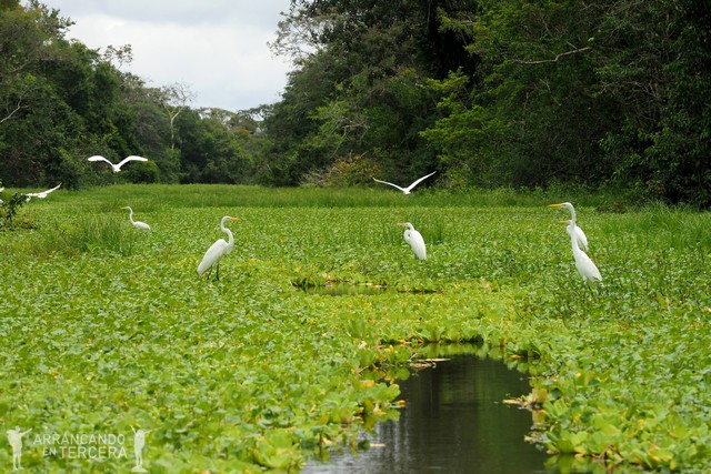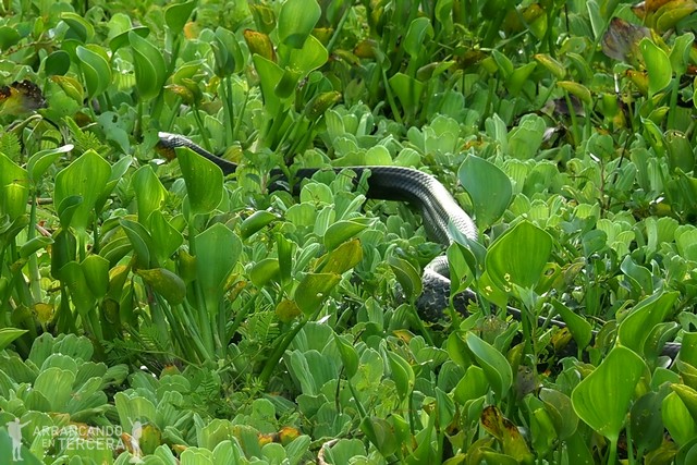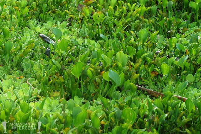 Nos establecemos en una zona muy tranquila, únicamente interrumpida por el grito de alguna pava y el salto de algún delfín sobre el agua. Un compañero badajocense detecta un movimiento sinuoso entre la vegetación flotante, a lo lejos; ¡y es nada menos que una serpiente! Apenas la vemos unos segundos y su cuerpo se pierde bamboleándose entre las plantas.