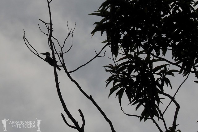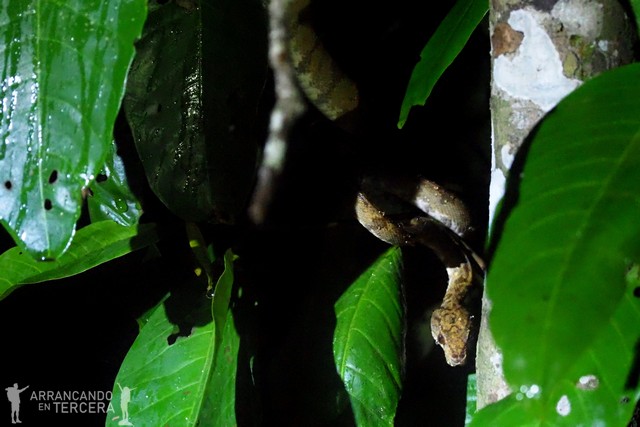 Llueve a mares y mucha gente se ha quedado en las cabañas, pero nosotros hemos venido a vivir la experiencia amazónica, así que ni lo dudamos: nos ponemos los trajes de capitán Pescanova, bolsa de plástico para la cámara y a la aventura. No podíamos despedirnos del Amazonas de otra manera que con una buena tormenta tropical. Volvemos a calarnos hasta los huesos, pero merece la pena, porque entre murciélagos y aves varias avistamos, oculta entre las sombras… ¡Una boa arborícola!