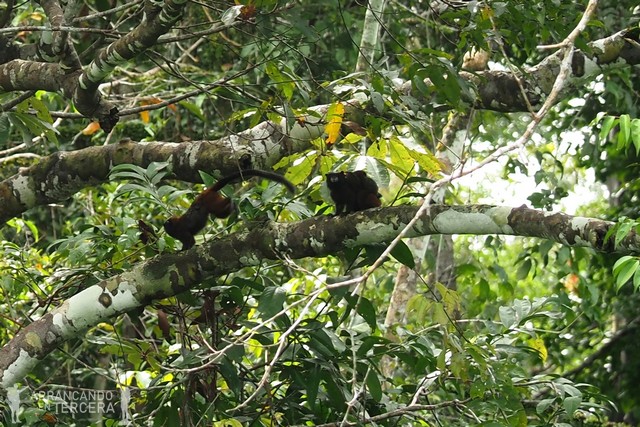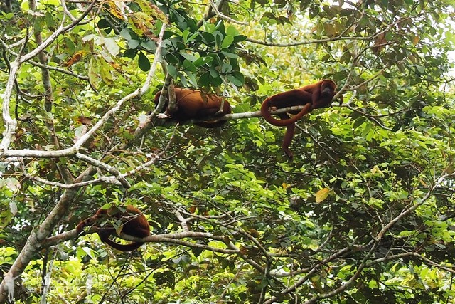 A lo lejos Edgar y Mayer localizan otra especie de primate que no habíamos visto: monos rojos aulladores. Son los monos más grandes de la selva amazónica, pesan 7 kilos y son muy territoriales.