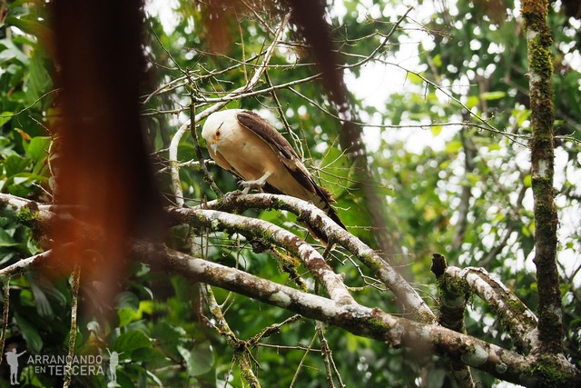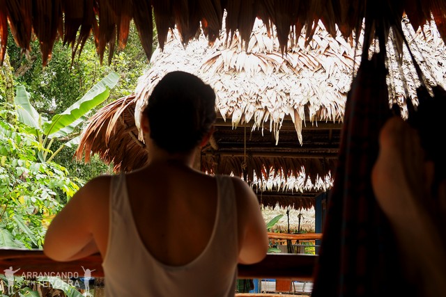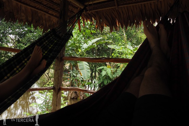 Finalizamos el paseo en barca, un poco decepcionados (pero poco) porque nos hacía ilusión ver una anaconda gigantesca poniendo sus escamas al sol. No pasa nada porque hasta en la cabaña estamos entretenidos; desde las hamacas nos divertimos un buen rato viendo cómo un ave rapaz construye concienzudamente su nido cogiendo ramitas de los tejados de todas nuestras cabañas.