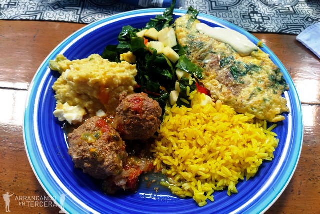 La comida de hoy es tan rica y abundante como de costumbre en el Muyuna. Arroz amarillo, quinoa con queso, albóndigas de carne y cebolla (sin harina), pescado pasado por huevo, espinacas…