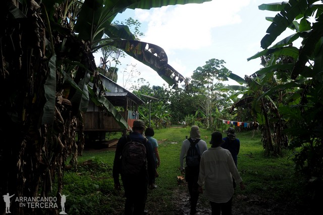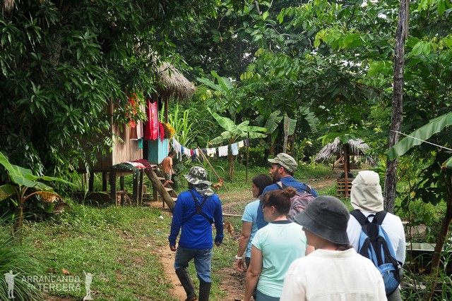 Después de una pequeña siesta, salimos a la excursión de la tarde que consiste en una visita al pueblo de SAN JUAN DE YANAYACO, con el que ya estamos familiarizados porque lo vemos todos los días. «Aparcamos» la barca a las afueras del pueblo y recorremos sus casas entre la jungla mientras Edgar nos explica curiosidades de sus cultivos y su cultura.