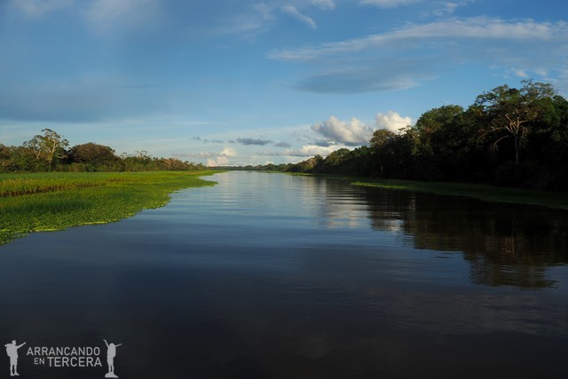 Edgar está empeñado en que veamos alguna anaconda porque sabe que siempre hace ilusión. Nos lleva por la zona donde las ve más a menudo; dice que suelen tumbarse a tomar el sol encima de las praderas flotantes. En silencio nos pegamos más de una hora buscando, concentrados y con los ojos investigando en cualquier rincón de la vegetación, pero no tenemos suerte.